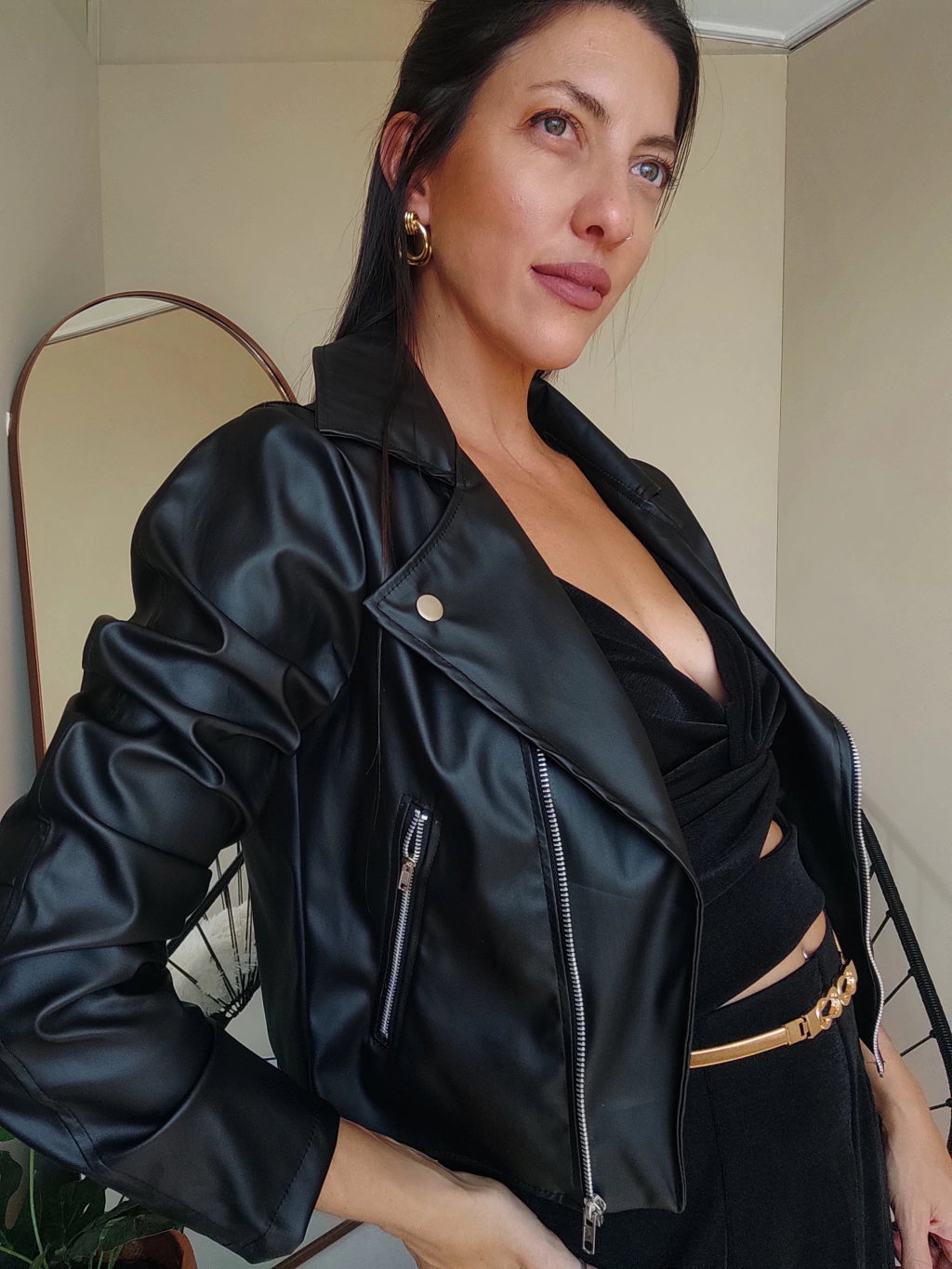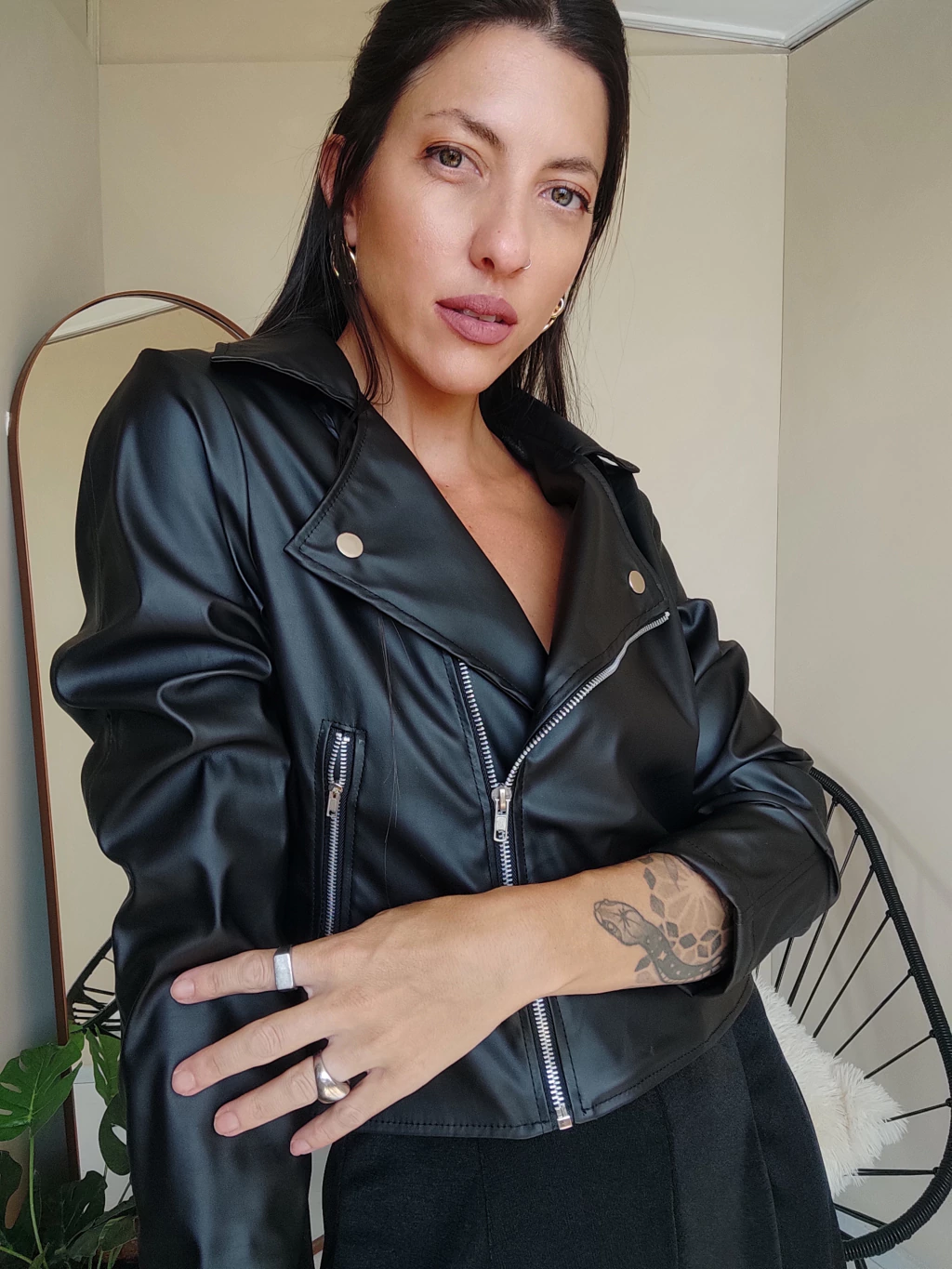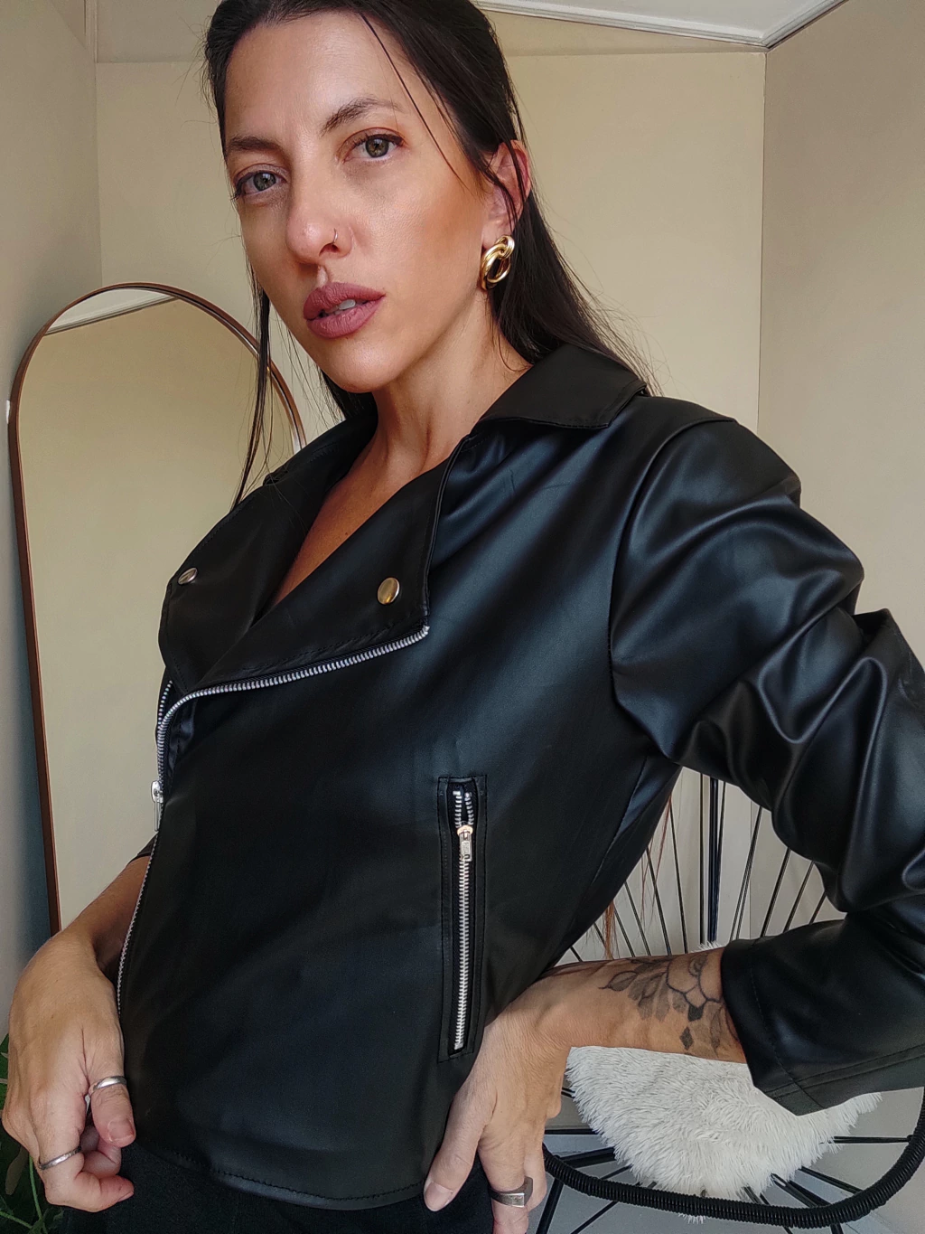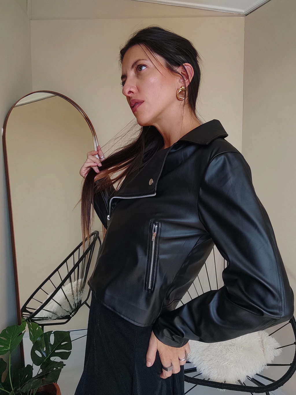 Campera motoquera reversionada en tela cuerina engomada. Talle 1 y 2. Disponible en negro y marrón (dulce de leche).