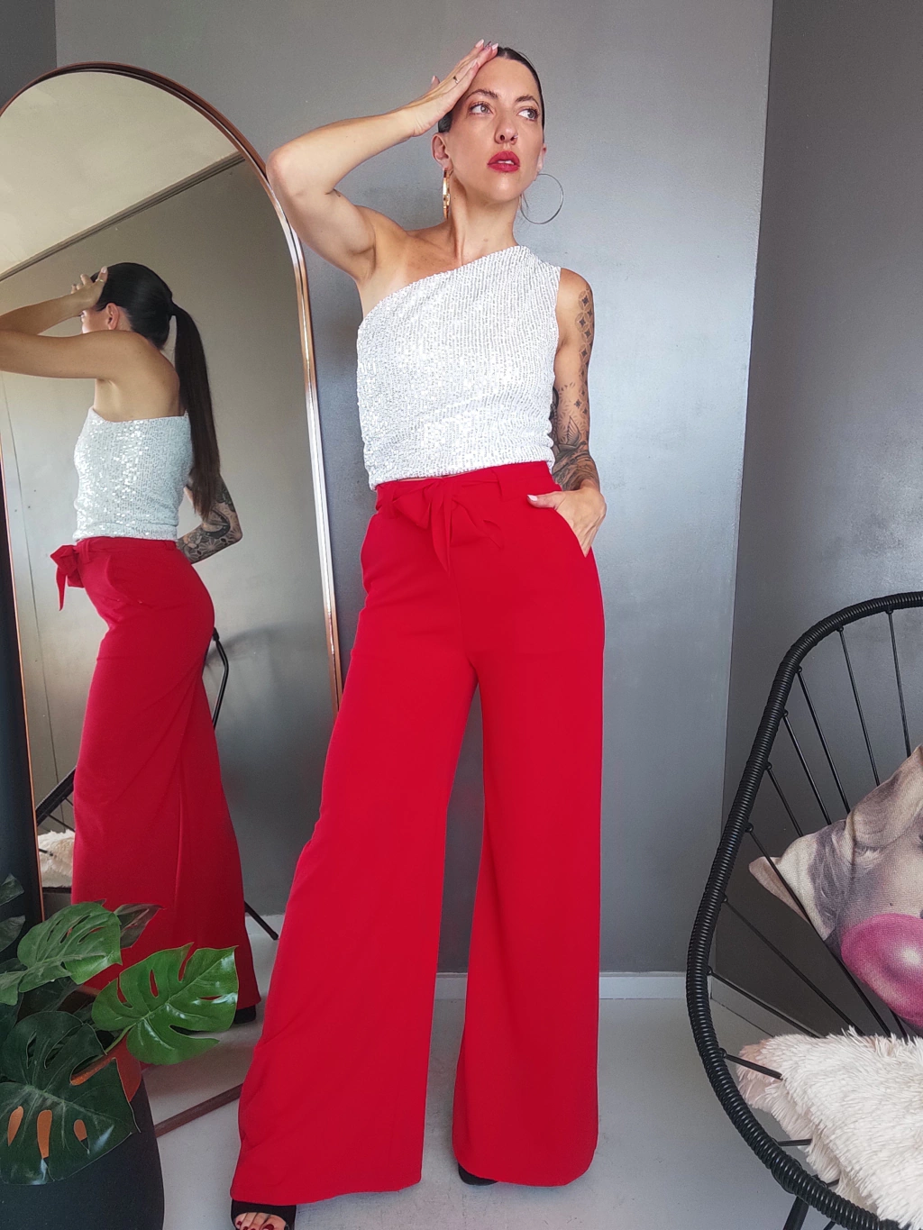 Pantalon de crep palazzo elastizado con pinzas, presillas y elastico en la cinuta con lazo en la cintura desmontable,